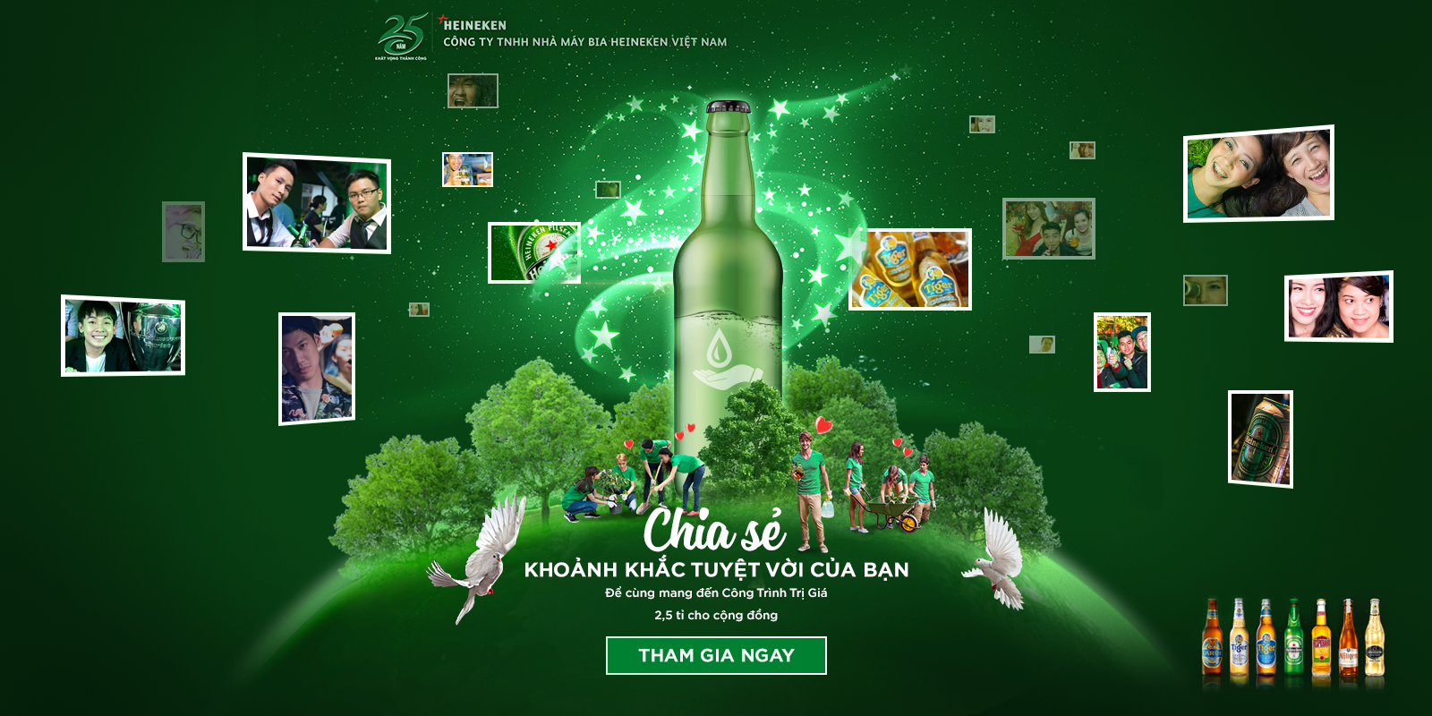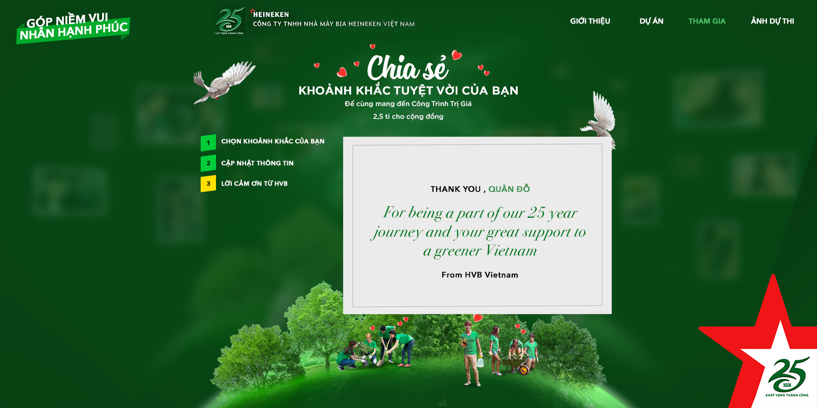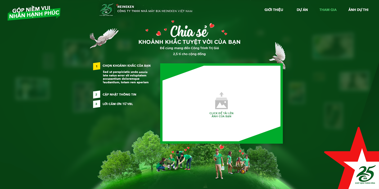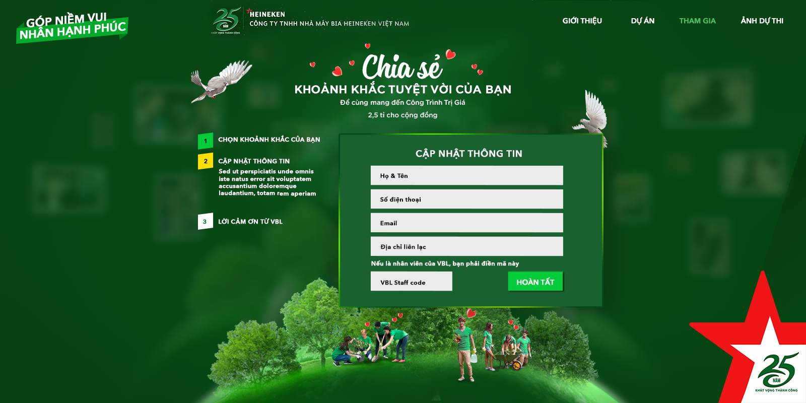 A landing page for internal VBL-Heineken staffs to participate in a charity to celebrate 25 years of VBL. They will send out 2.5 billion to rebuild Vietnam's forests.